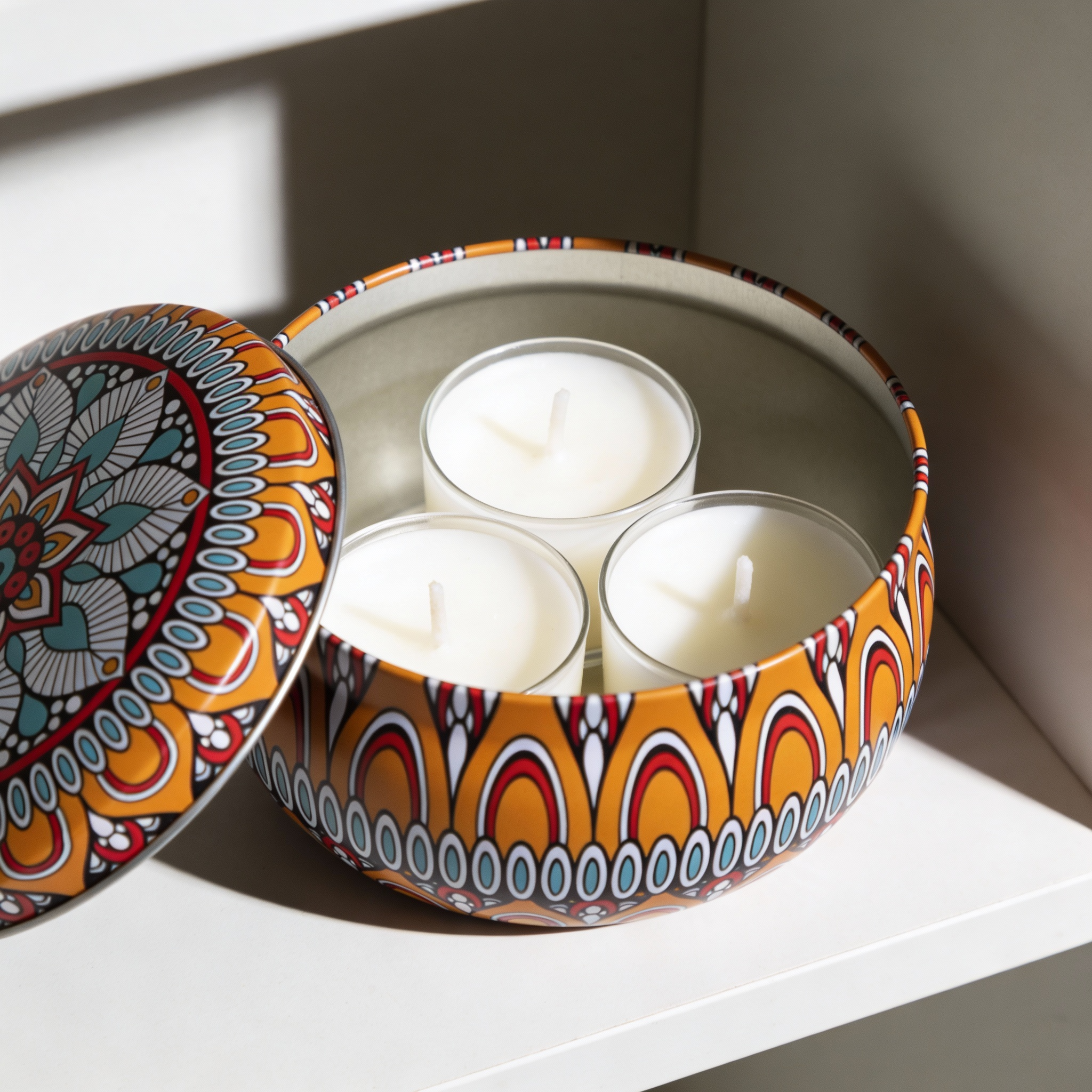 Mandala Metal Storage Tin 7.5 × 5 cm – Orange Tinplate Organizer with Blue & Red Design for Candles, Beads & Accessories (100g)