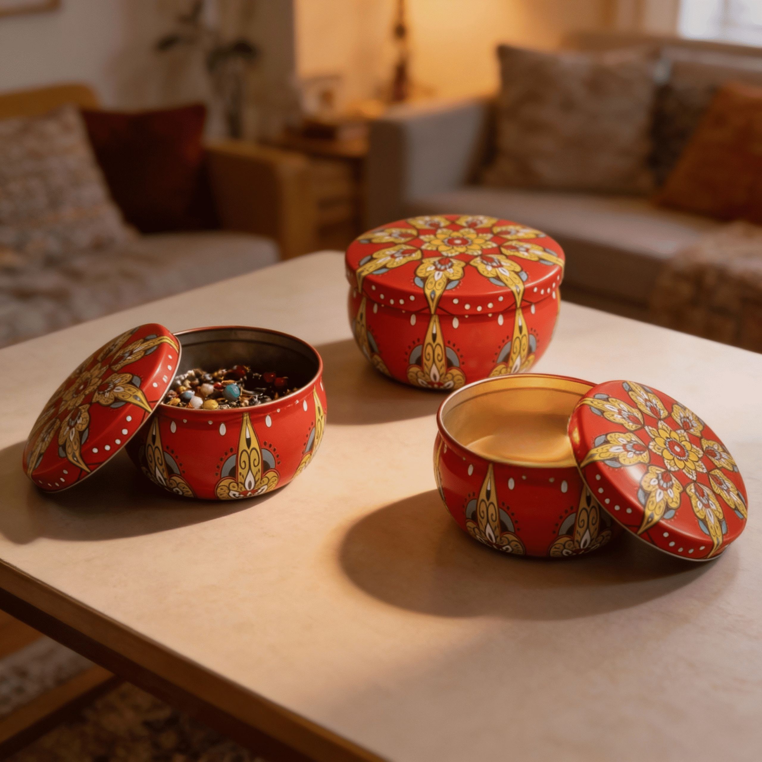 Red Tinplate Storage Tin with Yellow Design – Decorative Metal Organizer for Accessories & Candles (50g)